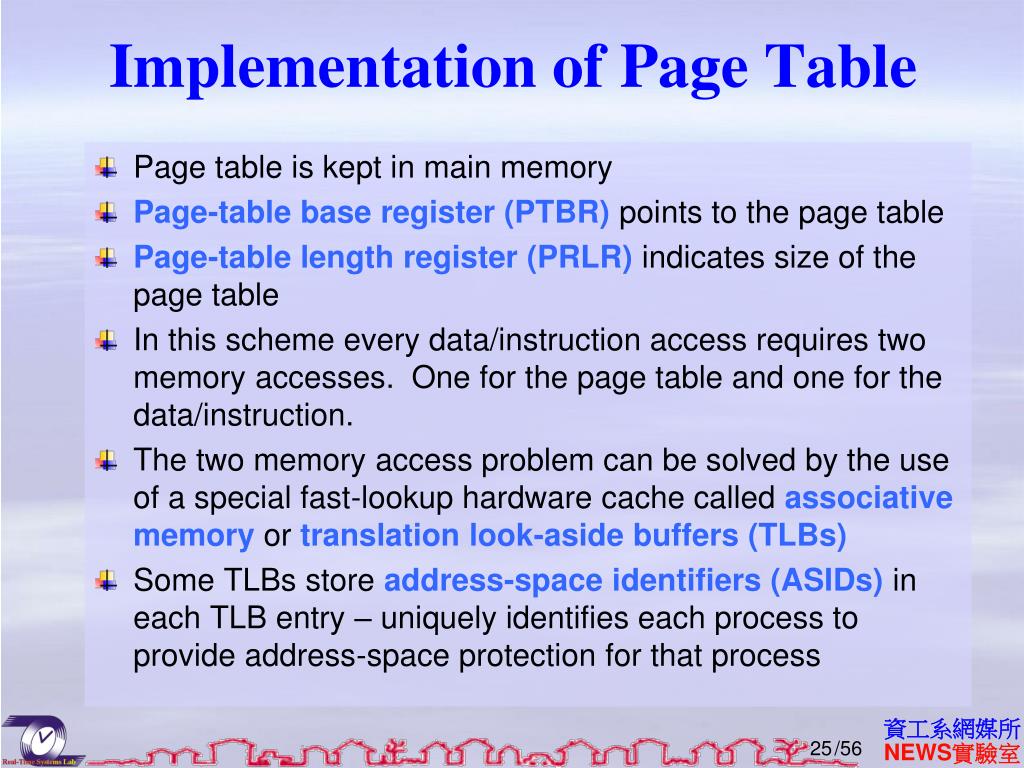 Implementation of Page Table • Page table is kept in main memory • Page-table base register (PTBR)points to the page table • Page-table length register (PRLR)indicates size of the page table • In this scheme every data/instruction access requires two memory accesses. One for the page table and one for the data/instruction. • The two memory access problem can be solved by the use of a special fast-lookup hardware cache called associative memory or translation look-aside buffers (TLBs) • Some TLBs storeaddress-space identifiers (ASIDs) in each TLB entry – uniquely identifies each process to provide address-space protection for that process /56