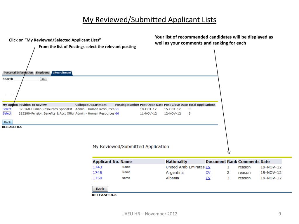 My Reviewed/Submitted Applicant Lists Your list of recommended candidates will be displayed as well as your comments and ranking for each Click on “My Reviewed/Selected Applicant Lists” From the list of Postings select the relevant posting UAEU HR – November 2012