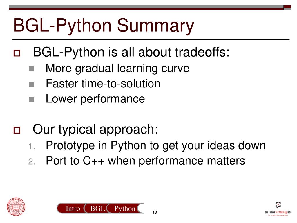 BGL-Python Summary • BGL-Python is all about tradeoffs: • More gradual learning curve • Faster time-to-solution • Lower performance • Our typical approach: • Prototype in Python to get your ideas down • Port to C++ when performance matters Intro BGL Python