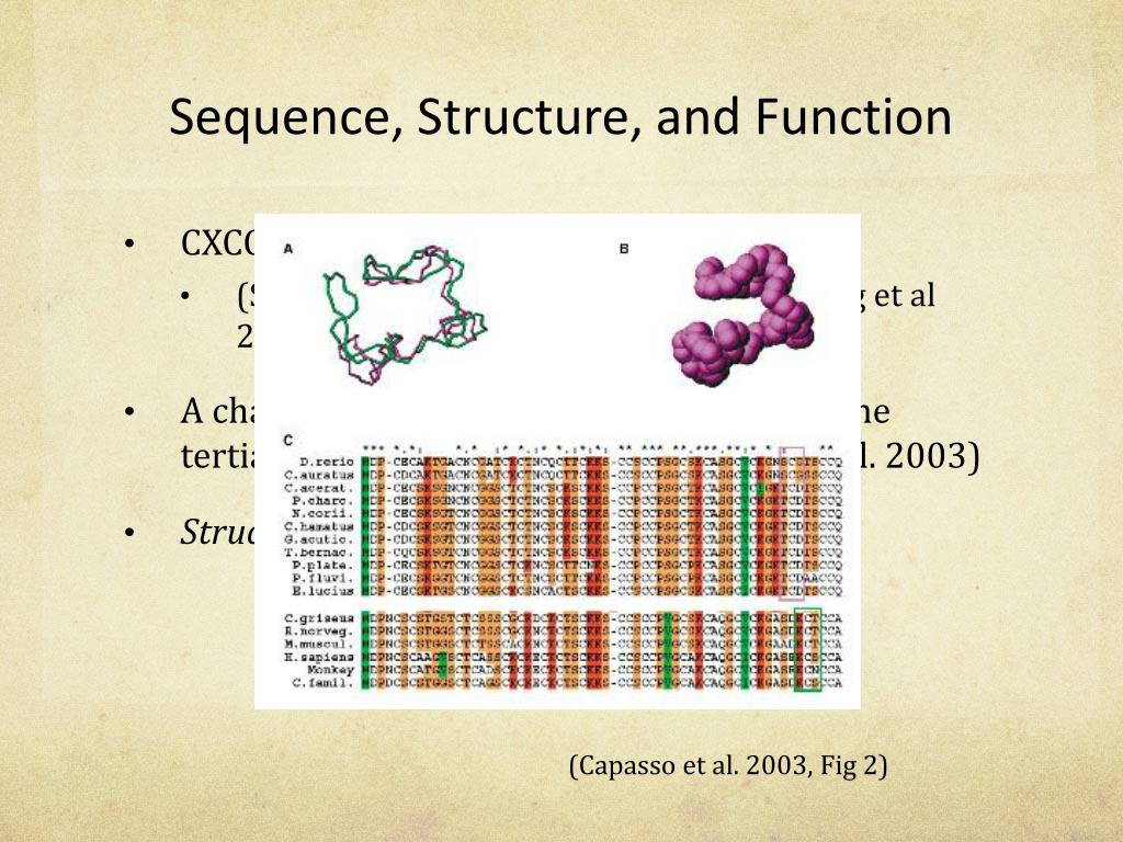 Sequence, Structure, and Function • CXCC (mammalian) CXXXCC (fish) • (Sucdiero et al. 2005) as cited in Kuo-Hsing et al 2010 • A change in primary structure influences the tertiary structure of proteins (Capasso et al. 2003) • Structure dictates Function (Capasso et al. 2003, Fig 2)