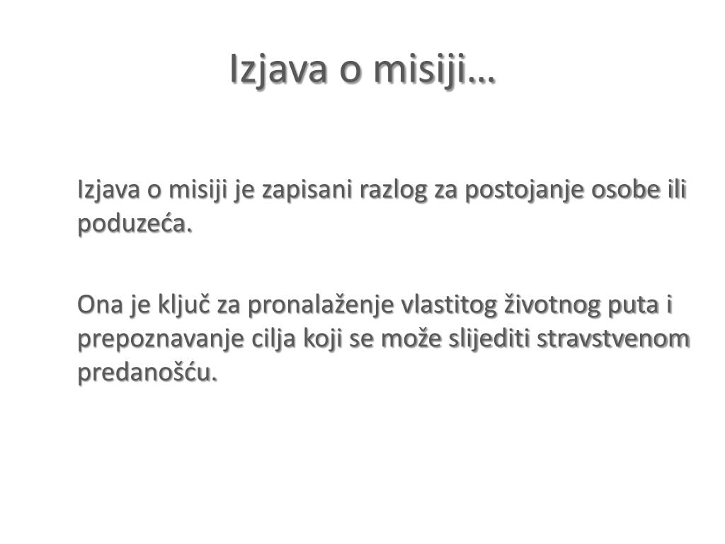 Izjava o misiji… Izjava o misiji je zapisani razlog za postojanje osobe ili poduzeća. Ona je ključ za pronalaženje vlastitog životnog puta i prepoznavanje cilja koji se može slijediti stravstvenom predanošću.