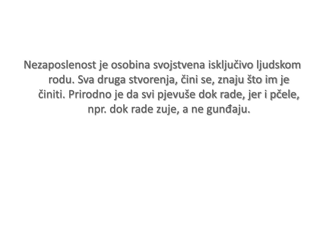 Nezaposlenost je osobina svojstvena isključivo ljudskom rodu. Sva druga stvorenja, čini se, znaju što im je činiti. Prirodno je da svi pjevuše dok rade, jer i pčele, npr. dok rade zuje, a ne gunđaju.