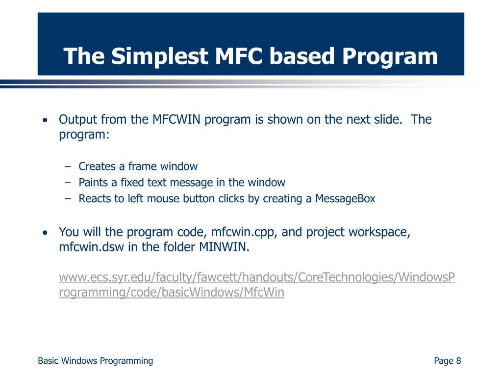The Simplest MFC based Program • Output from the MFCWIN program is shown on the next slide. The program: • Creates a frame window • Paints a fixed text message in the window • Reacts to left mouse button clicks by creating a MessageBox • You will the program code, mfcwin.cpp, and project workspace, mfcwin.dsw in the folder MINWIN.www.ecs.syr.edu/faculty/fawcett/handouts/CoreTechnologies/WindowsProgramming/code/basicWindows/MfcWin