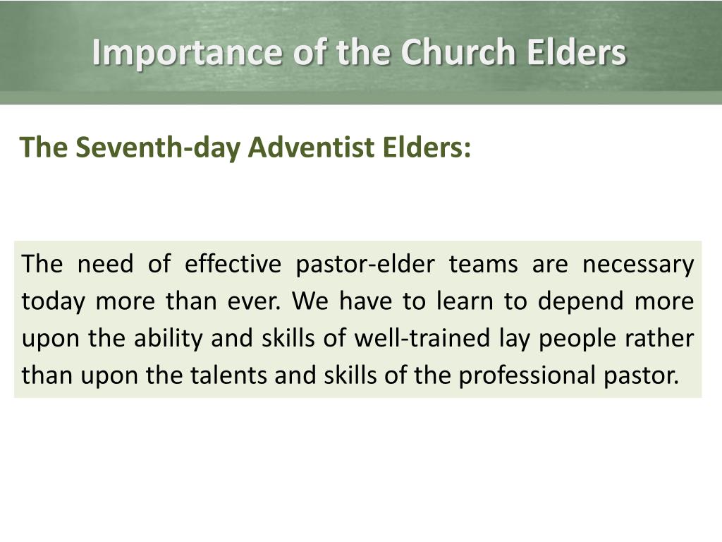 Importance of the Church Elders The Seventh-day Adventist Elders: The need of effective pastor-elder teams are necessary today more than ever. We have to learn to depend more upon the ability and skills of well-trained lay people rather than upon the talents and skills of the professional pastor.