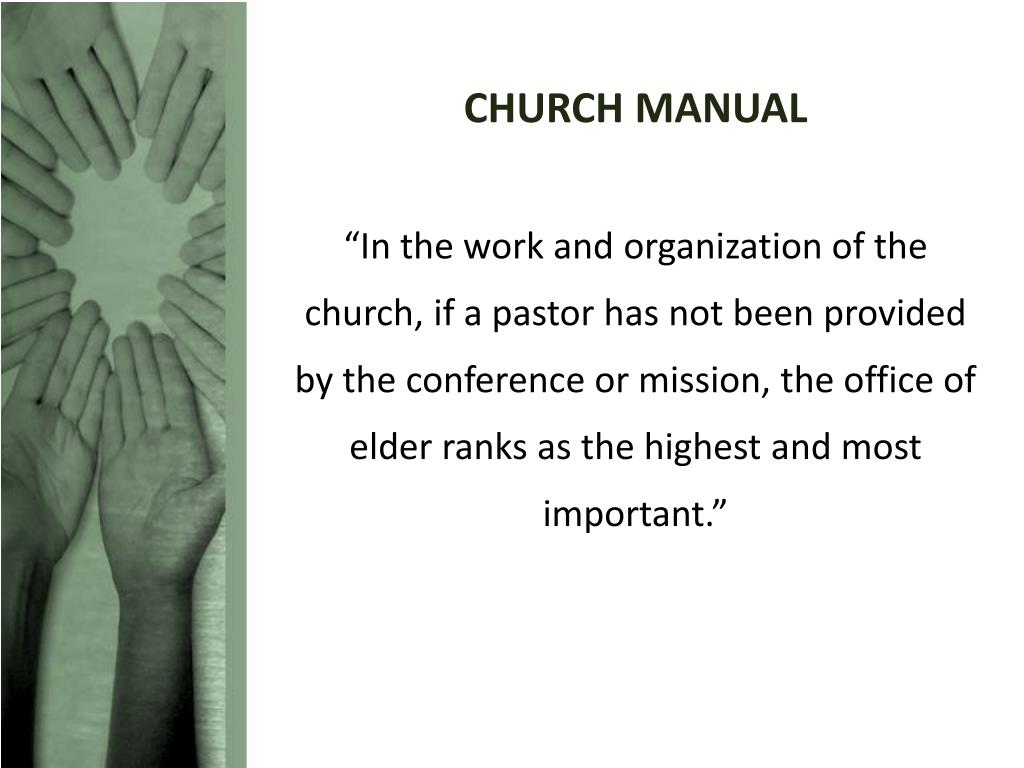 CHURCH MANUAL “In the work and organization of the church, if a pastor has not been provided by the conference or mission, the office of elder ranks as the highest and most important.”