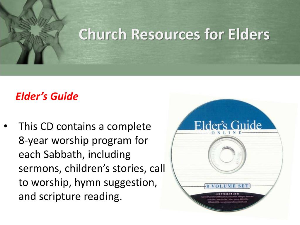 Church Resources for Elders Elder’s Guide • This CD contains a complete 8-year worship program for each Sabbath, including sermons, children’s stories, call to worship, hymn suggestion, and scripture reading.