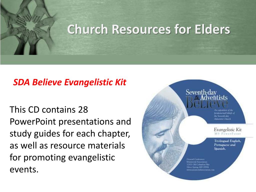Church Resources for Elders SDA Believe Evangelistic Kit This CD contains 28 PowerPoint presentations and study guides for each chapter, as well as resource materials for promoting evangelistic events.