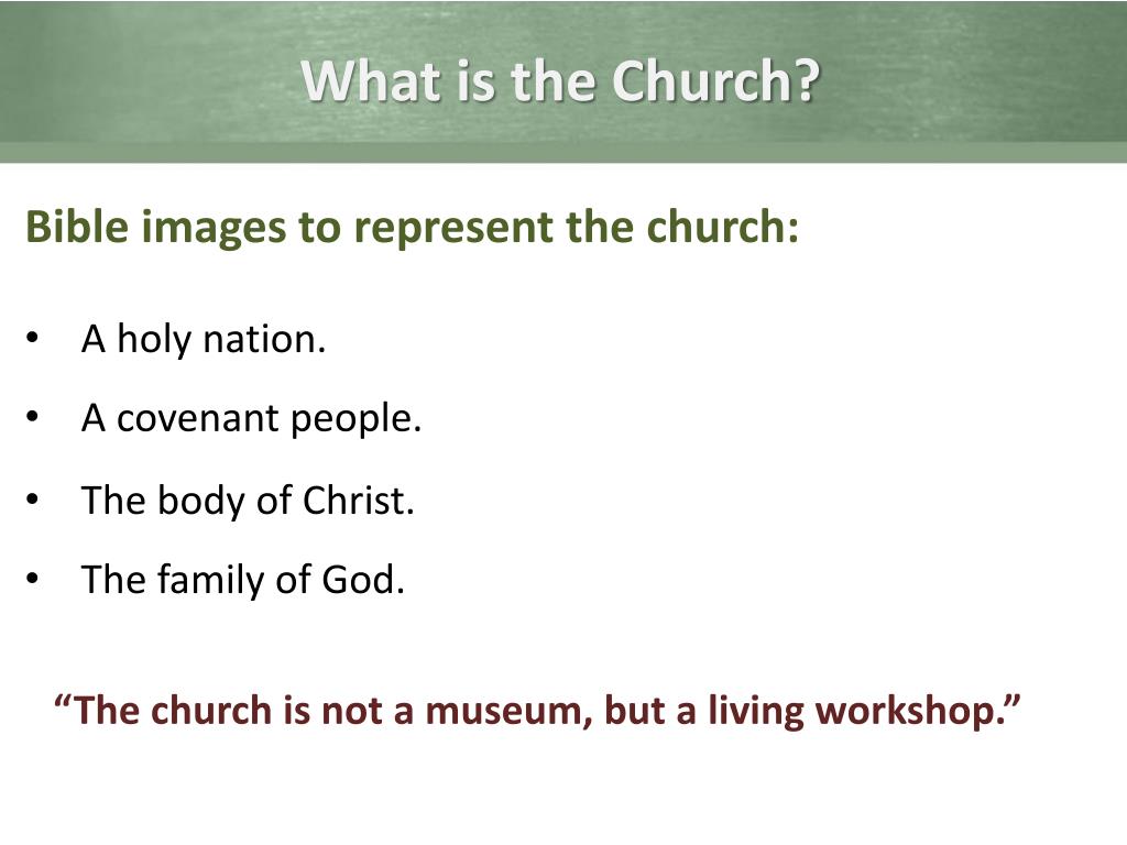What is the Church? • Bible images to represent the church: • A holy nation. • A covenant people. • The body of Christ. • The family of God. “The church is not a museum, but a living workshop.”