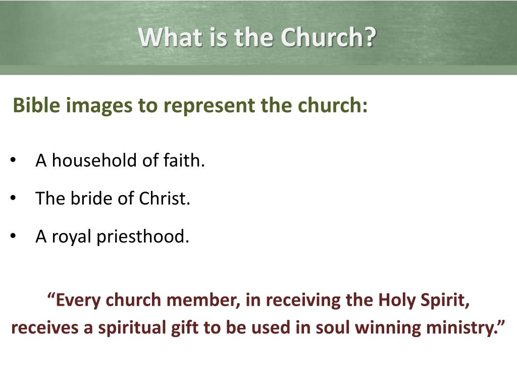 What is the Church? Bible images to represent the church: • A household of faith. • The bride of Christ. • A royal priesthood. “Every church member, in receiving the Holy Spirit, receives a spiritual gift to be used in soul winning ministry.”