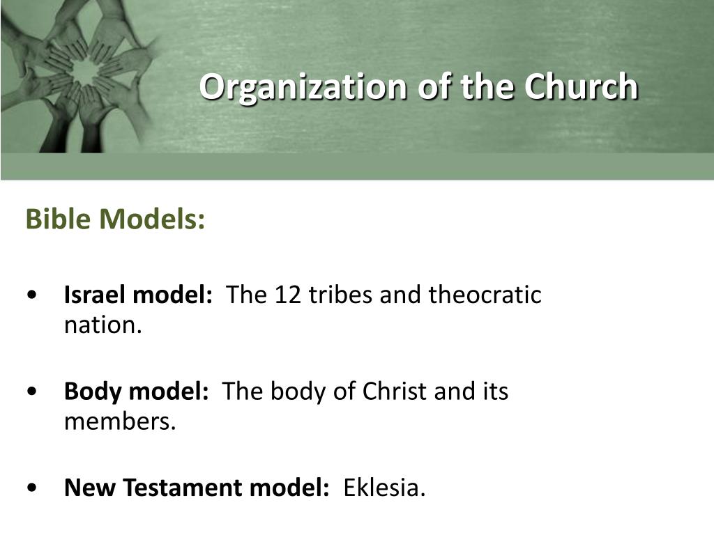 Organization of the Church • Bible Models: • Israel model: The 12 tribes and theocratic nation. • Body model: The body of Christ and its members. • New Testament model: Eklesia.