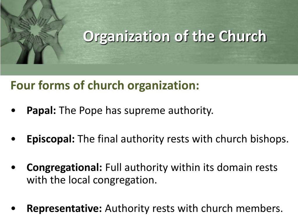 Organization of the Church • Four forms of church organization: • Papal: The Pope has supreme authority. • Episcopal: The final authority rests with church bishops. • Congregational: Full authority within its domain rests with the local congregation. • Representative: Authority rests with church members.