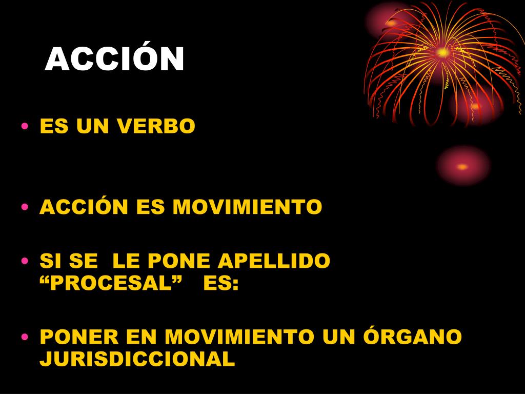 ACCIÓN • ES UN VERBO • ACCIÓN ES MOVIMIENTO • SI SE LE PONE APELLIDO “PROCESAL” ES: • PONER EN MOVIMIENTO UN ÓRGANO JURISDICCIONAL
