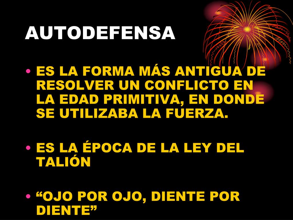 AUTODEFENSA • ES LA FORMA MÁS ANTIGUA DE RESOLVER UN CONFLICTO EN LA EDAD PRIMITIVA, EN DONDE SE UTILIZABA LA FUERZA. • ES LA ÉPOCA DE LA LEY DEL TALIÓN • “OJO POR OJO, DIENTE POR DIENTE”