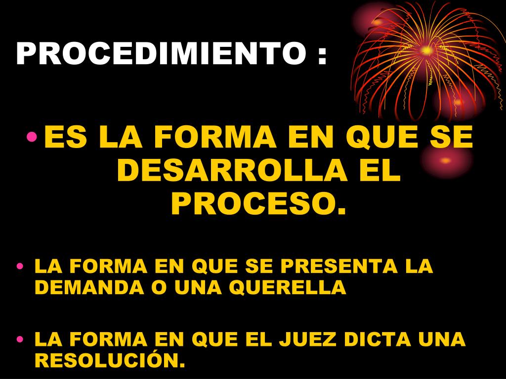 PROCEDIMIENTO : • ES LA FORMA EN QUE SE DESARROLLA EL PROCESO. • LA FORMA EN QUE SE PRESENTA LA DEMANDA O UNA QUERELLA • LA FORMA EN QUE EL JUEZ DICTA UNA RESOLUCIÓN.