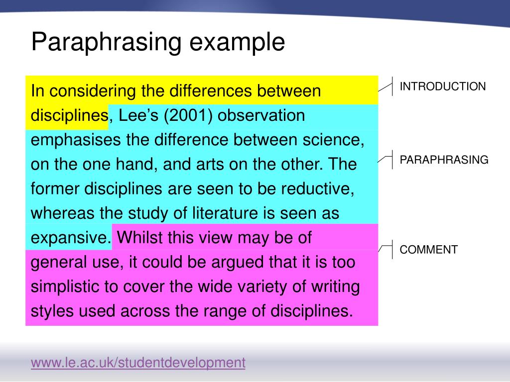Paraphrasing example In considering the differences between disciplines, Lee’s (2001) observation emphasises the difference between science, on the one hand, and arts on the other. The former disciplines are seen to be reductive, whereas the study of literature is seen as expansive. Whilst this view may be of general use, it could be argued that it is too simplistic to cover the wide variety of writing styles used across the range of disciplines. INTRODUCTION PARAPHRASING COMMENT