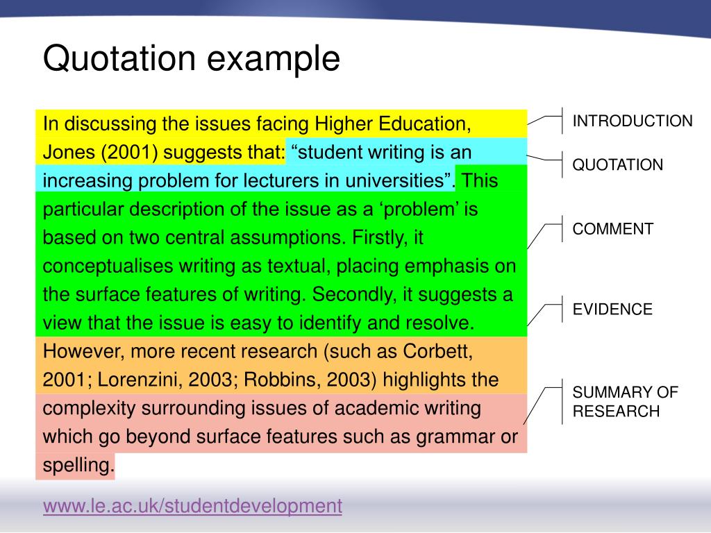 Quotation example In discussing the issues facing Higher Education, Jones (2001) suggests that: “student writing is an increasing problem for lecturers in universities”. This particular description of the issue as a ‘problem’ is based on two central assumptions. Firstly, it conceptualises writing as textual, placing emphasis on the surface features of writing. Secondly, it suggests a view that the issue is easy to identify and resolve. However, more recent research (such as Corbett, 2001; Lorenzini, 2003; Robbins, 2003) highlights the complexity surrounding issues of academic writing which go beyond surface features such as grammar or spelling. INTRODUCTION QUOTATION COMMENT EVIDENCE SUMMARY OF RESEARCH