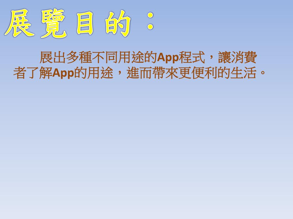 展覽目的: 展出多種不同用途的App程式,讓消費者了解App的用途,進而帶來更便利的生活。