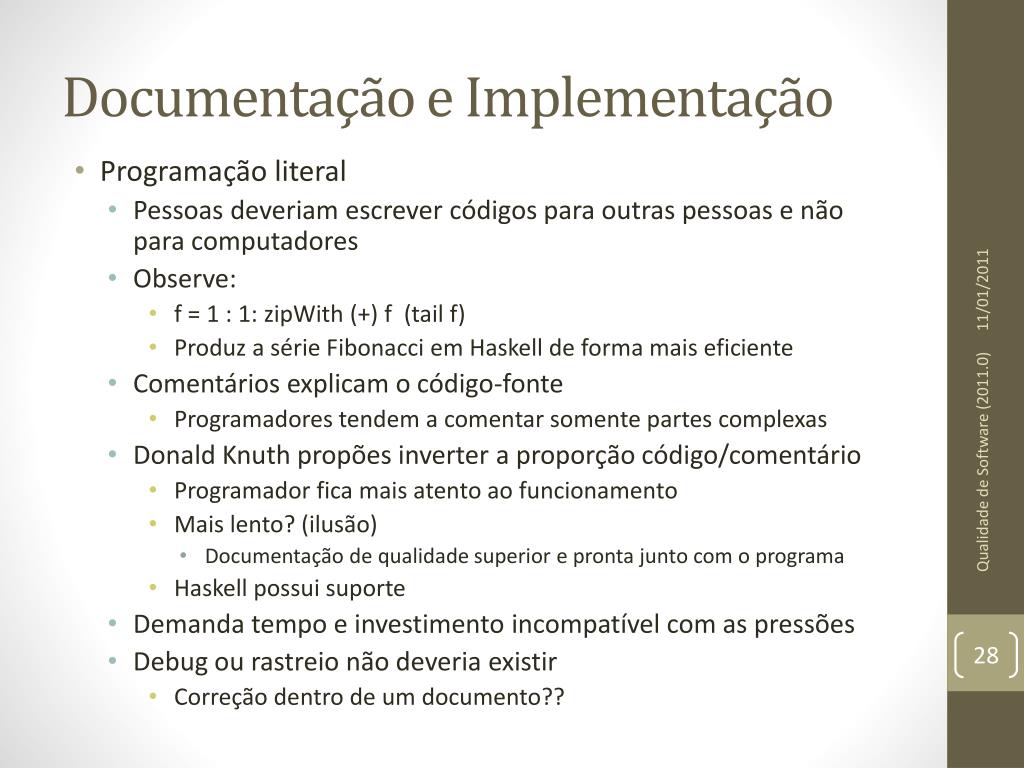 Documentação e Implementação • Programação literal • Pessoas deveriam escrever códigos para outras pessoas e não para computadores • Observe: • f = 1 : 1: zipWith (+) f (tail f) • Produz a série Fibonacci em Haskell de forma mais eficiente • Comentários explicam o código-fonte • Programadores tendem a comentar somente partes complexas • Donald Knuth propões inverter a proporção código/comentário • Programador fica mais atento ao funcionamento • Mais lento? (ilusão) • Documentação de qualidade superior e pronta junto com o programa • Haskell possui suporte • Demanda tempo e investimento incompatível com as pressões • Debug ou rastreio não deveria existir • Correção dentro de um documento?? Qualidade de Software (2011.0)