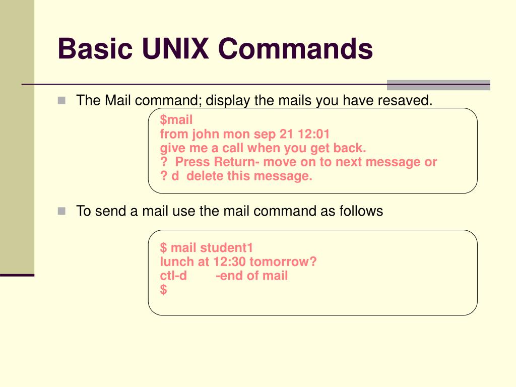 Basic UNIX Commands • The Mail command; display the mails you have resaved. $mail from john mon sep 21 12:01 give me a call when you get back. ? Press Return- move on to next message or ? d delete this message. • To send a mail use the mail command as follows $ mail student1 lunch at 12:30 tomorrow? ctl-d -end of mail $
