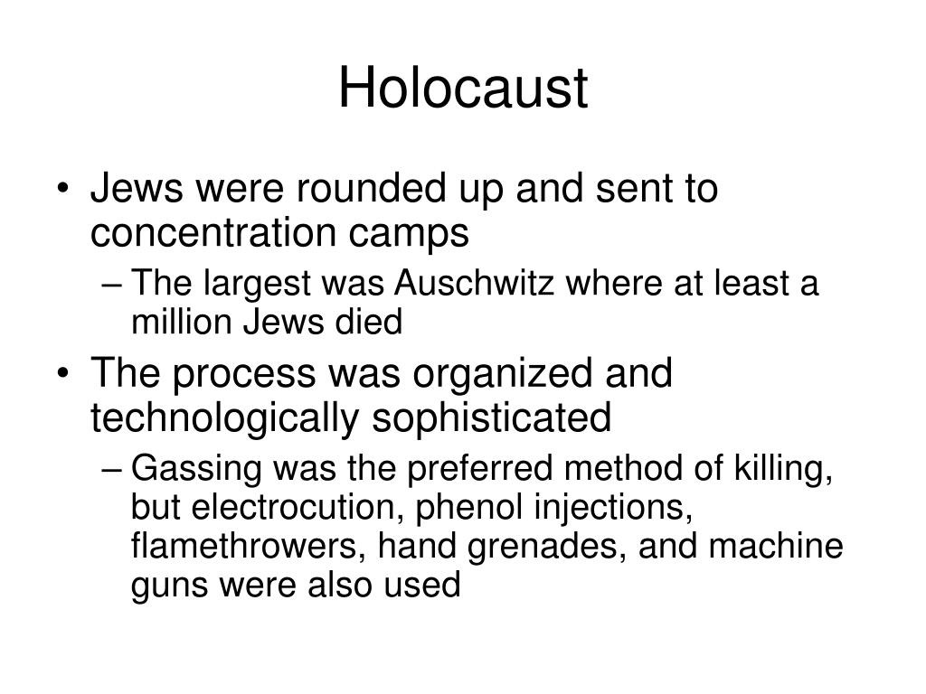 Holocaust • Jews were rounded up and sent to concentration camps • The largest was Auschwitz where at least a million Jews died • The process was organized and technologically sophisticated • Gassing was the preferred method of killing, but electrocution, phenol injections, flamethrowers, hand grenades, and machine guns were also used