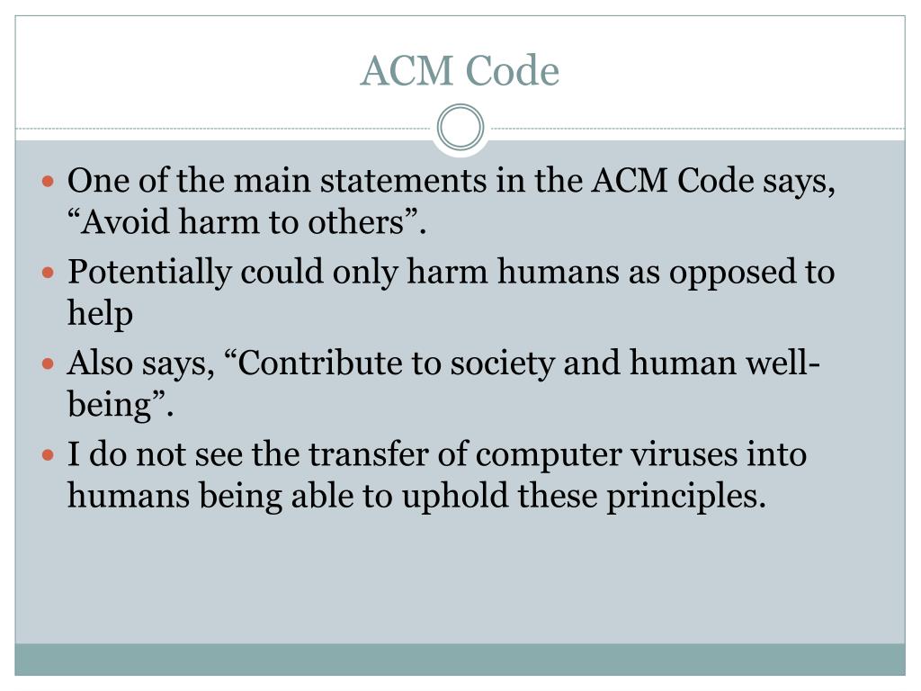 ACM Code One of the main statements in the ACM Code says, “Avoid harm to others”. Potentially could only harm humans as opposed to help Also says, “Contribute to society and human well-being”. I do not see the transfer of computer viruses into humans being able to uphold these principles.