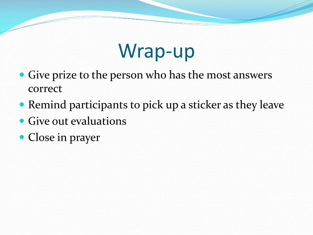 Wrap-up • Give prize to the person who has the most answers correct • Remind participants to pick up a sticker as they leave • Give out evaluations • Close in prayer