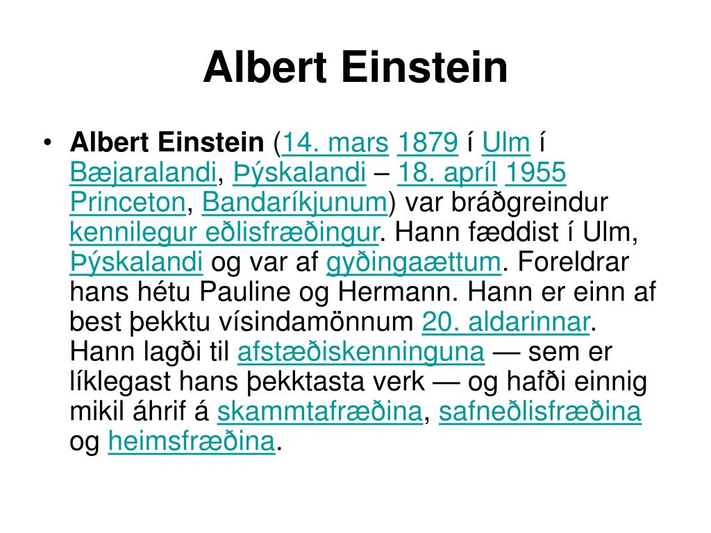 Albert Einstein • Albert Einstein (14. mars1879 í Ulm í Bæjaralandi, Þýskalandi – 18. apríl1955Princeton, Bandaríkjunum) var bráðgreindur kennilegur eðlisfræðingur. Hann fæddist í Ulm, Þýskalandi og var af gyðingaættum. Foreldrar hans hétu Pauline og Hermann. Hann er einn af best þekktu vísindamönnum 20. aldarinnar. Hann lagði til afstæðiskenninguna — sem er líklegast hans þekktasta verk — og hafði einnig mikil áhrif á skammtafræðina, safneðlisfræðina og heimsfræðina.