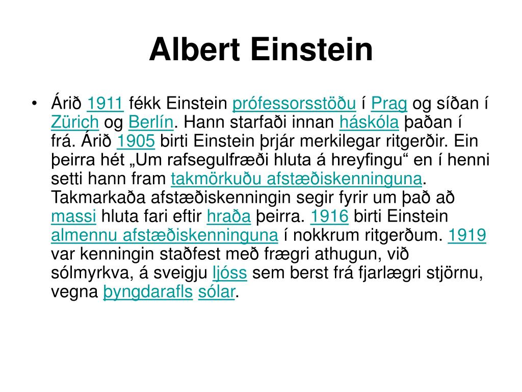 Albert Einstein • Árið 1911 fékk Einstein prófessorsstöðu í Prag og síðan í Zürich og Berlín. Hann starfaði innan háskóla þaðan í frá. Árið 1905 birti Einstein þrjár merkilegar ritgerðir. Ein þeirra hét „Um rafsegulfræði hluta á hreyfingu“ en í henni setti hann fram takmörkuðu afstæðiskenninguna. Takmarkaða afstæðiskenningin segir fyrir um það að massi hluta fari eftir hraða þeirra. 1916 birti Einstein almennu afstæðiskenninguna í nokkrum ritgerðum. 1919 var kenningin staðfest með frægri athugun, við sólmyrkva, á sveigju ljóss sem berst frá fjarlægri stjörnu, vegna þyngdaraflssólar.