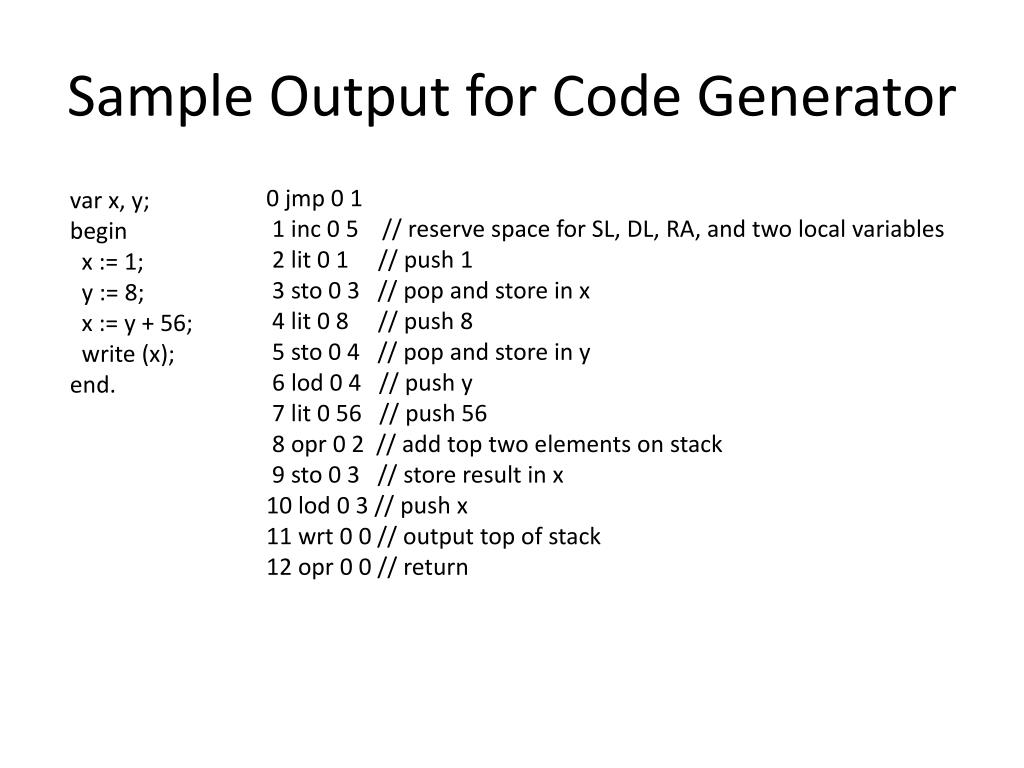 Sample Output for Code Generator 0 jmp 0 1 1 inc 0 5 // reserve space for SL, DL, RA, and two local variables 2 lit 0 1 // push 1 3 sto 0 3 // pop and store in x 4 lit 0 8 // push 8 5 sto 0 4 // pop and store in y 6 lod 0 4 // push y 7 lit 0 56 // push 56 8 opr 0 2 // add top two elements on stack 9 sto 0 3 // store result in x 10 lod 0 3 // push x 11 wrt 0 0 // output top of stack 12 opr 0 0 // return var x, y; begin x := 1; y := 8; x := y + 56; write (x); end.