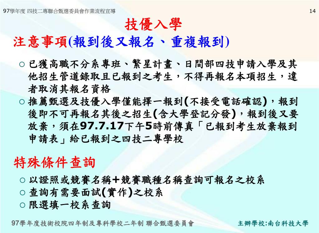 97學年度 四技二專聯合甄選委員會作業流程宣導 技優入學 特殊條件查詢 (96學年度範例)