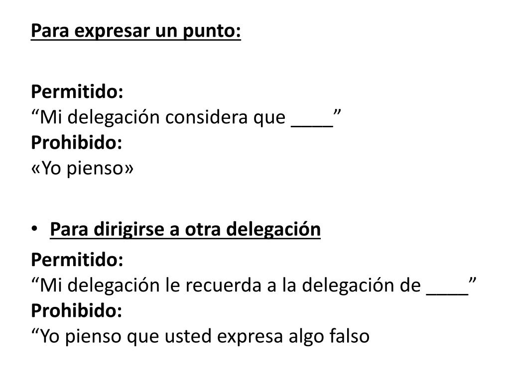 Para expresar un punto: Permitido:“Mi delegación considera que ____”Prohibido:«Yo pienso» • Para dirigirse a otra delegación Permitido:“Mi delegación le recuerda a la delegación de ____”Prohibido:“Yo pienso que usted expresa algo falso