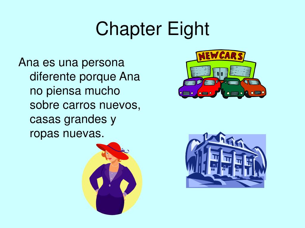 Chapter Eight Ana es una persona diferente porque Ana no piensa mucho sobre carros nuevos, casas grandes y ropas nuevas.