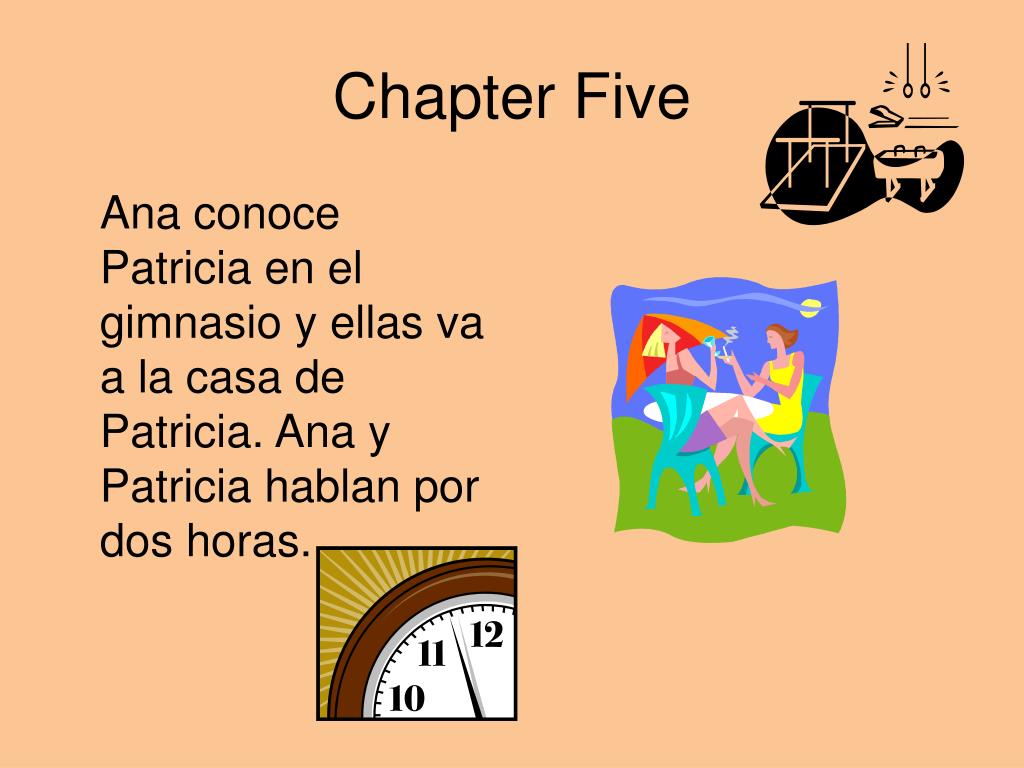 Chapter Five Ana conoce Patricia en el gimnasio y ellas va a la casa de Patricia. Ana y Patricia hablan por dos horas.
