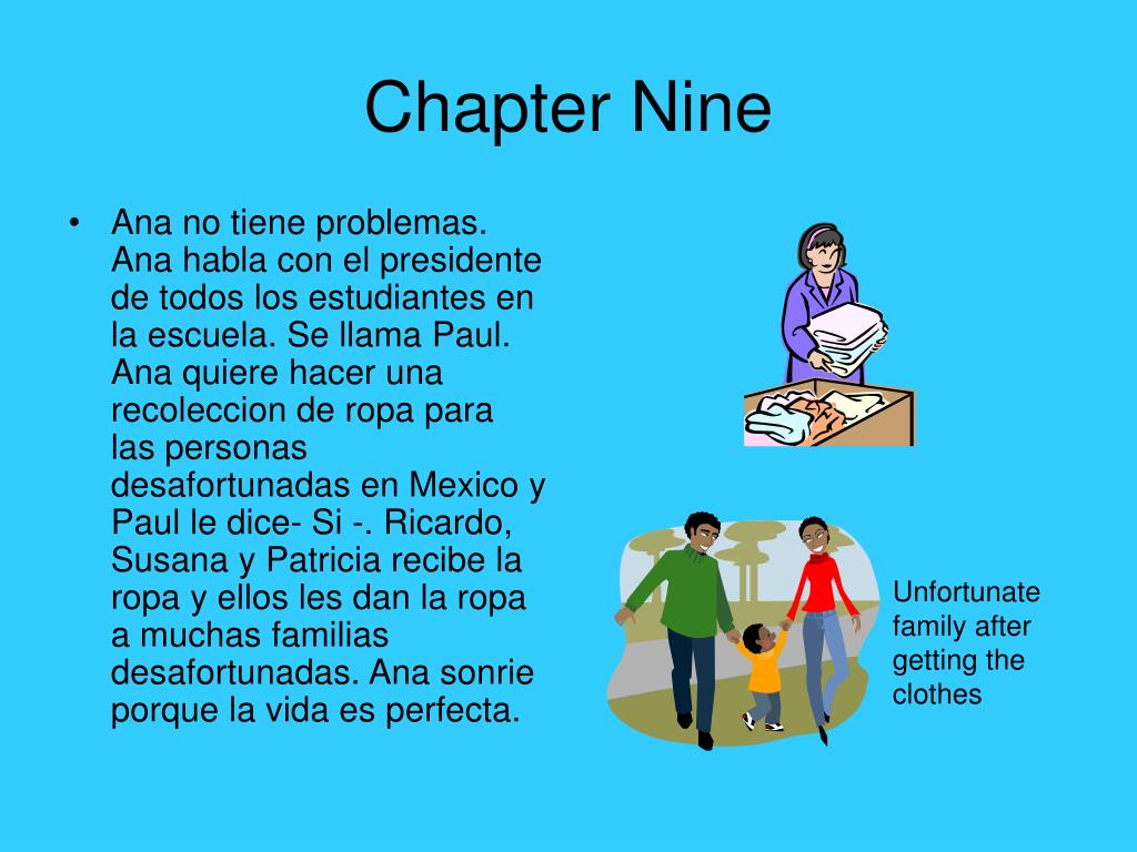 Chapter Nine • Ana no tiene problemas. Ana habla con el presidente de todos los estudiantes en la escuela. Se llama Paul. Ana quiere hacer una recoleccion de ropa para las personas desafortunadas en Mexico y Paul le dice- Si -. Ricardo, Susana y Patricia recibe la ropa y ellos les dan la ropa a muchas familias desafortunadas. Ana sonrie porque la vida es perfecta. Unfortunate family after getting the clothes