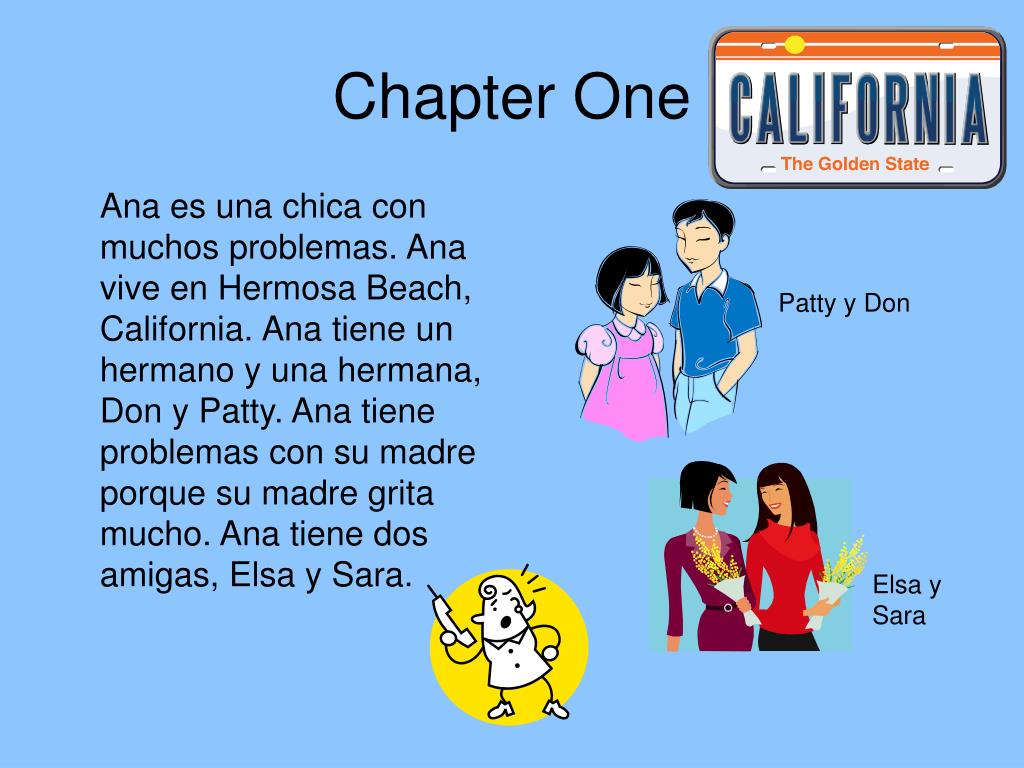 Chapter One Ana es una chica con muchos problemas. Ana vive en Hermosa Beach, California. Ana tiene un hermano y una hermana, Don y Patty. Ana tiene problemas con su madre porque su madre grita mucho. Ana tiene dos amigas, Elsa y Sara. Patty y Don Elsa y Sara