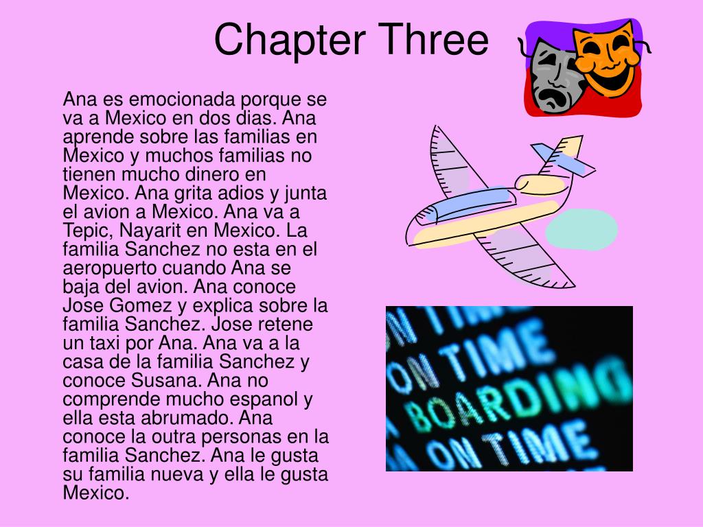 Chapter Three Ana es emocionada porque se va a Mexico en dos dias. Ana aprende sobre las familias en Mexico y muchos familias no tienen mucho dinero en Mexico. Ana grita adios y junta el avion a Mexico. Ana va a Tepic, Nayarit en Mexico. La familia Sanchez no esta en el aeropuerto cuando Ana se baja del avion. Ana conoce Jose Gomez y explica sobre la familia Sanchez. Jose retene un taxi por Ana. Ana va a la casa de la familia Sanchez y conoce Susana. Ana no comprende mucho espanol y ella esta abrumado. Ana conoce la outra personas en la familia Sanchez. Ana le gusta su familia nueva y ella le gusta Mexico.