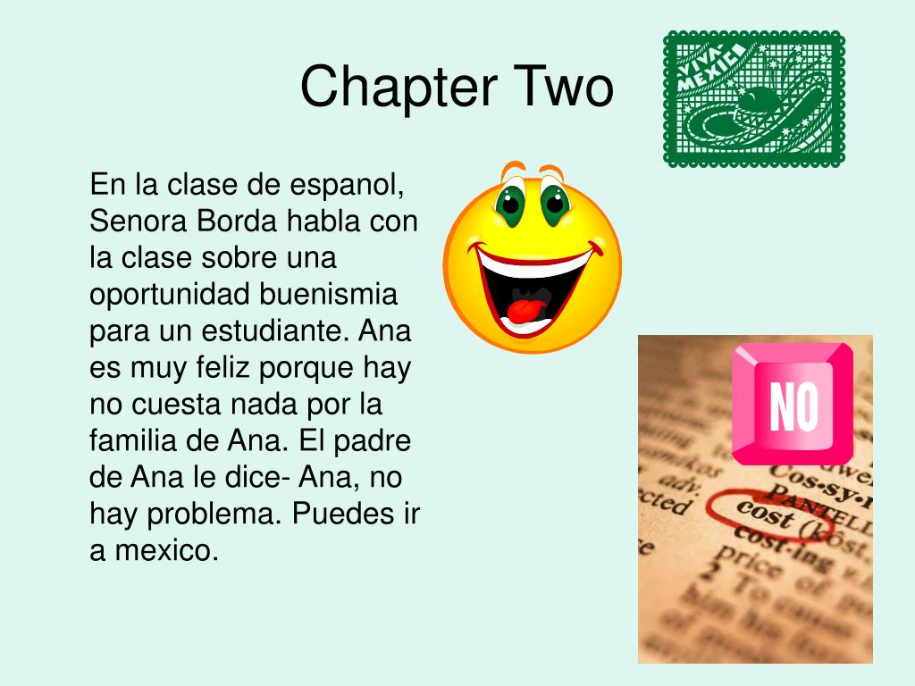 Chapter Two En la clase de espanol, Senora Borda habla con la clase sobre una oportunidad buenismia para un estudiante. Ana es muy feliz porque hay no cuesta nada por la familia de Ana. El padre de Ana le dice- Ana, no hay problema. Puedes ir a mexico.