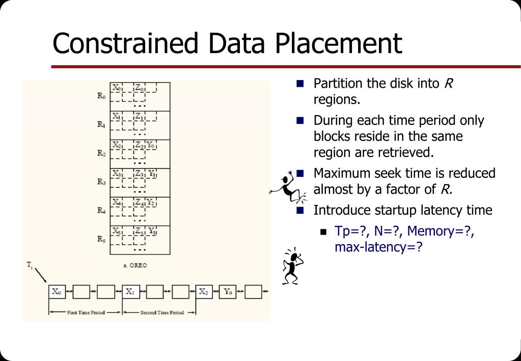 Constrained Data Placement • Partition the disk into R regions. • During each time period only blocks reside in the same region are retrieved. • Maximum seek time is reduced almost by a factor of R. • Introduce startup latency time • Tp=?, N=?, Memory=?, max-latency=?
