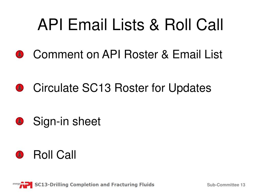 API Email Lists & Roll Call • Comment on API Roster & Email List • Circulate SC13 Roster for Updates • Sign-in sheet • Roll Call