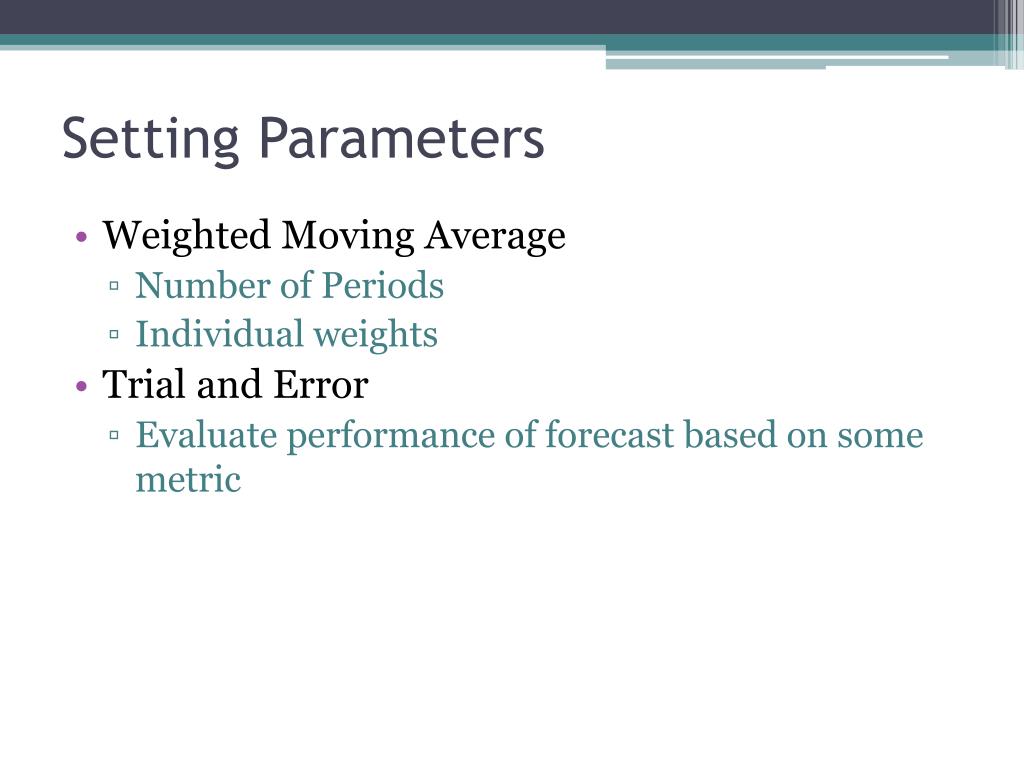 Setting Parameters • Weighted Moving Average • Number of Periods • Individual weights • Trial and Error • Evaluate performance of forecast based on some metric