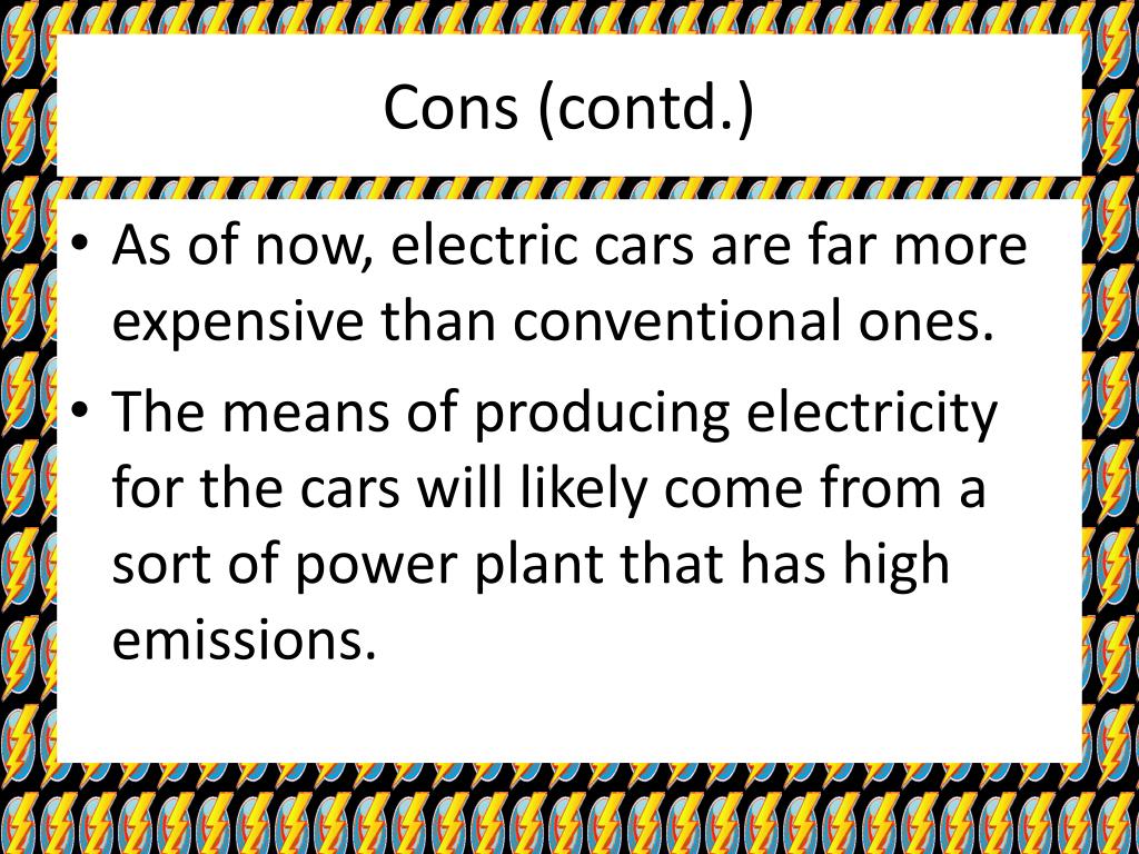 Cons (contd.) • As of now, electric cars are far more expensive than conventional ones. • The means of producing electricity for the cars will likely come from a sort of power plant that has high emissions.