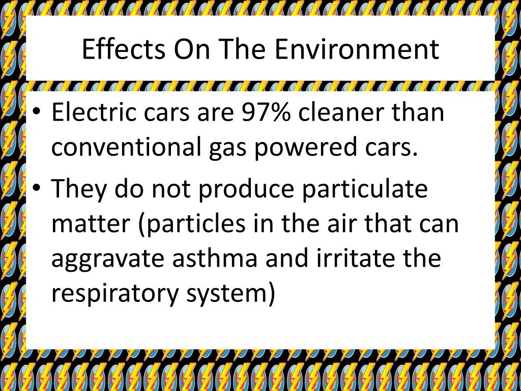 Effects On The Environment • Electric cars are 97% cleaner than conventional gas powered cars. • They do not produce particulate matter (particles in the air that can aggravate asthma and irritate the respiratory system)