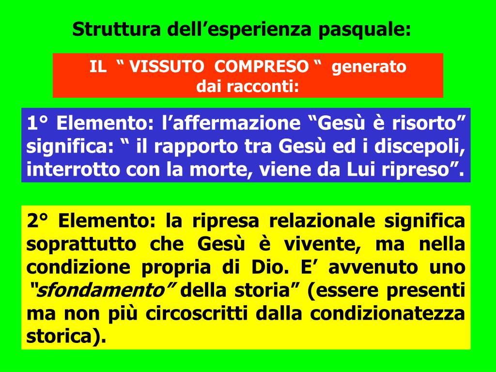 Struttura dell’esperienza pasquale: IL “ VISSUTO COMPRESO “ generato dai racconti: 1° Elemento: l’affermazione “Gesù è risorto” significa: “ il rapporto tra Gesù ed i discepoli, interrotto con la morte, viene da Lui ripreso”. 2° Elemento: la ripresa relazionale significa soprattutto che Gesù è vivente, ma nella condizione propria di Dio. E’ avvenuto uno “sfondamento” della storia” (essere presenti ma non più circoscritti dalla condizionatezza storica).
