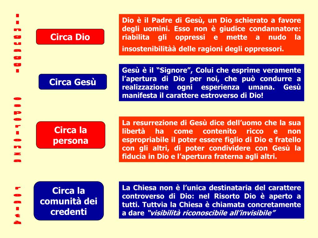 Dio è il Padre di Gesù, un Dio schierato a favore degli uomini. Esso non è giudice condannatore: riabilita gli oppressi e mette a nudo la insostenibilitàà delle ragioni degli oppressori. Circa Dio Gesù è il “Signore”, Colui che esprime veramente l’apertura di Dio per noi, che può condurre a realizzazione ogni esperienza umana. Gesù manifesta il carattere estroverso di Dio! Circa Gesù linguaggi esperienza realtà La resurrezione di Gesù dice dell’uomo che la sua libertà ha come contenito ricco e non espropriabile il poter essere figlio di Dio e fratello con gli altri, di poter condividere con Gesù la fiducia in Dio e l’apertura fraterna agli altri. Circa la persona Circa la comunità dei credenti La Chiesa non è l’unica destinataria del carattere controverso di Dio: nel Risorto Dio è aperto a tutti. Tuttvia la Chiesa è chiamata concretamente a dare “visibilità riconoscibile all’invisibile”