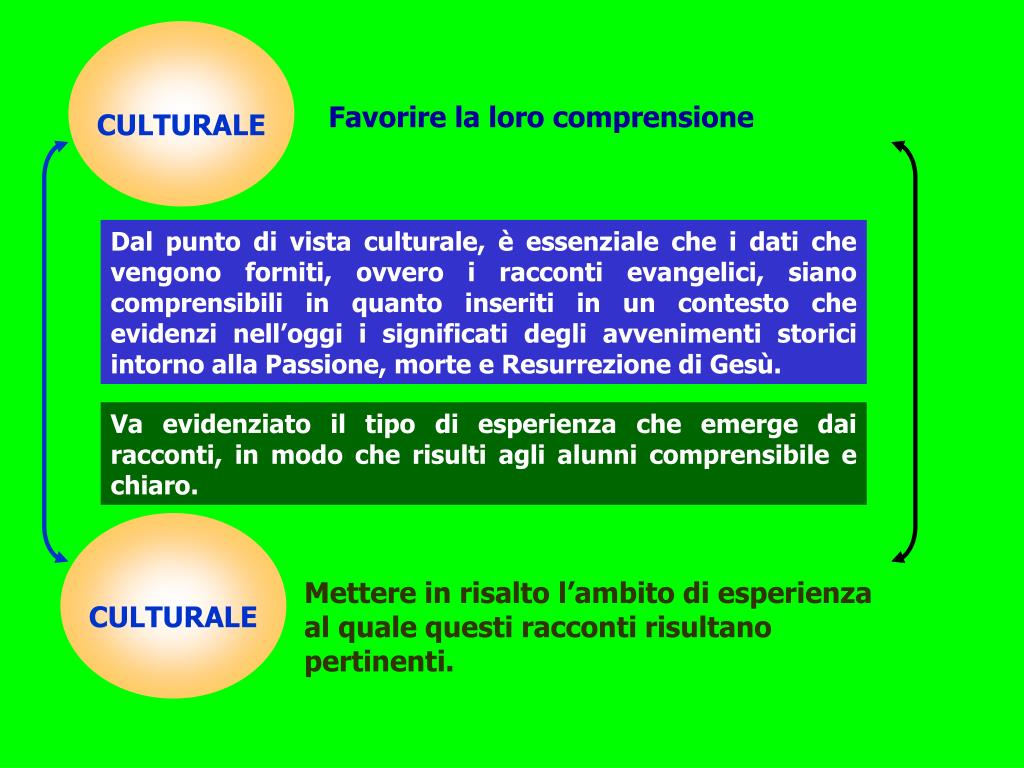 CULTURALE CULTURALE Favorire la loro comprensione Dal punto di vista culturale, è essenziale che i dati che vengono forniti, ovvero i racconti evangelici, siano comprensibili in quanto inseriti in un contesto che evidenzi nell’oggi i significati degli avvenimenti storici intorno alla Passione, morte e Resurrezione di Gesù. Va evidenziato il tipo di esperienza che emerge dai racconti, in modo che risulti agli alunni comprensibile e chiaro. Mettere in risalto l’ambito di esperienza al quale questi racconti risultano pertinenti.