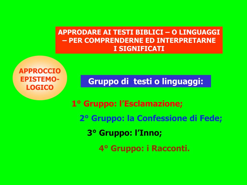 APPROCCIOEPISTEMO-LOGICO APPRODARE AI TESTI BIBLICI – O LINGUAGGI – PER COMPRENDERNE ED INTERPRETARNE I SIGNIFICATI Gruppo di testi o linguaggi: 1° Gruppo: l’Esclamazione; 2° Gruppo: la Confessione di Fede; 3° Gruppo: l’Inno; 4° Gruppo: i Racconti.