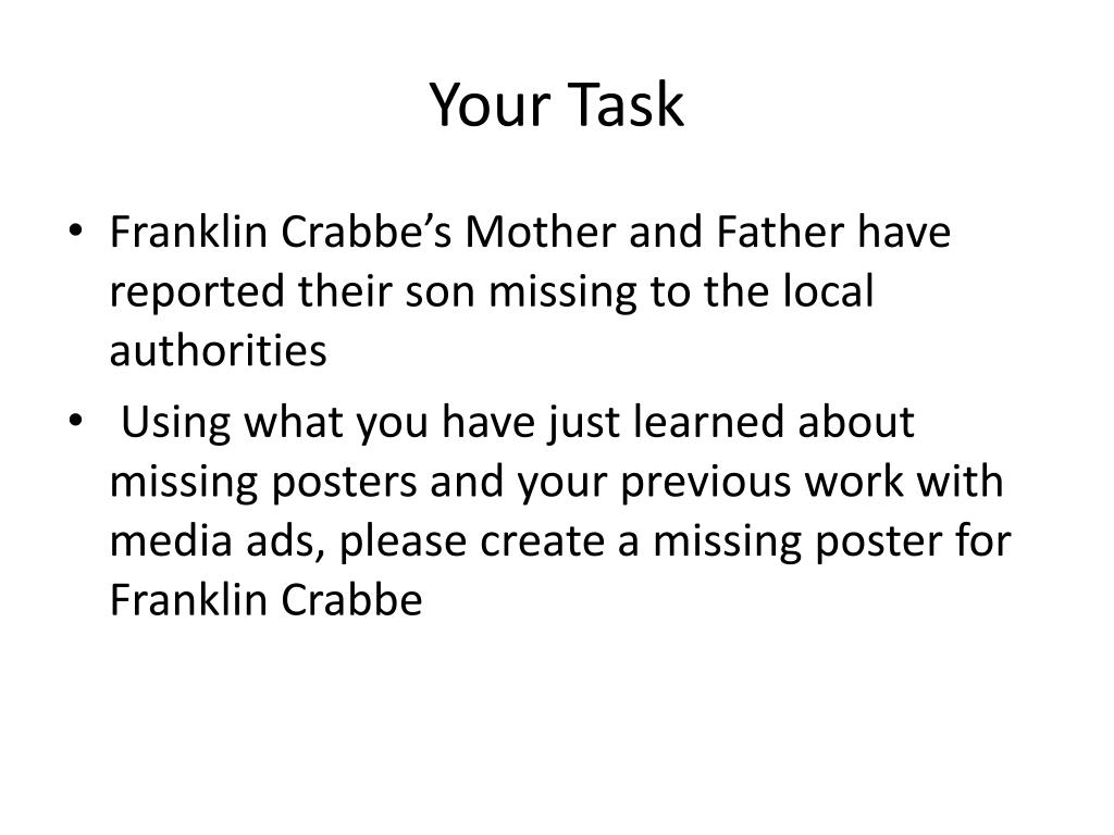 Your Task • Franklin Crabbe’s Mother and Father have reported their son missing to the local authorities • Using what you have just learned about missing posters and your previous work with media ads, please create a missing poster for Franklin Crabbe