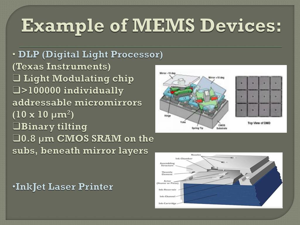 Example of MEMS Devices: • DLP (Digital Light Processor) (Texas Instruments) • Light Modulating chip • >100000 individually addressable micromirrors (10 x 10 µm2) • Binary tilting • 0.8 µm CMOS SRAM on the subs, beneath mirror layers • InkJet Laser Printer