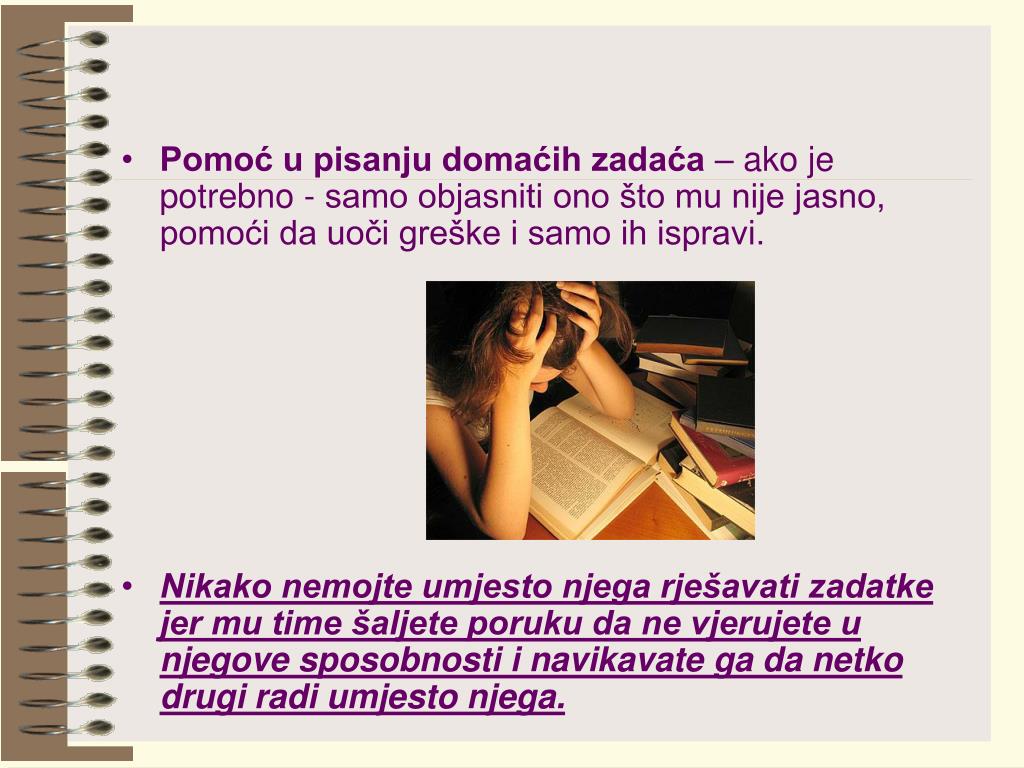Pomoć u pisanju domaćih zadaća – ako je potrebno - samo objasniti ono što mu nije jasno, pomoći da uoči greške i samo ih ispravi. • Nikako nemojte umjesto njega rješavati zadatke jer mu time šaljete poruku da ne vjerujete u njegove sposobnosti i navikavate ga da netko drugi radi umjesto njega.