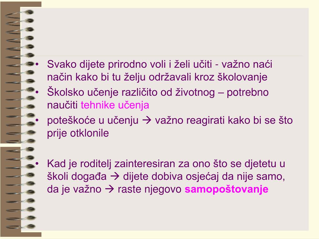 Svako dijete prirodno voli i želi učiti - važno naći način kako bi tu želju održavali kroz školovanje • Školsko učenje različito od životnog – potrebno naučiti tehnike učenja • poteškoće u učenju važno reagirati kako bi se što prije otklonile • Kad je roditelj zainteresiran za ono što se djetetu u školi događa dijete dobiva osjećaj da nije samo, da je važno rastenjegovo samopoštovanje
